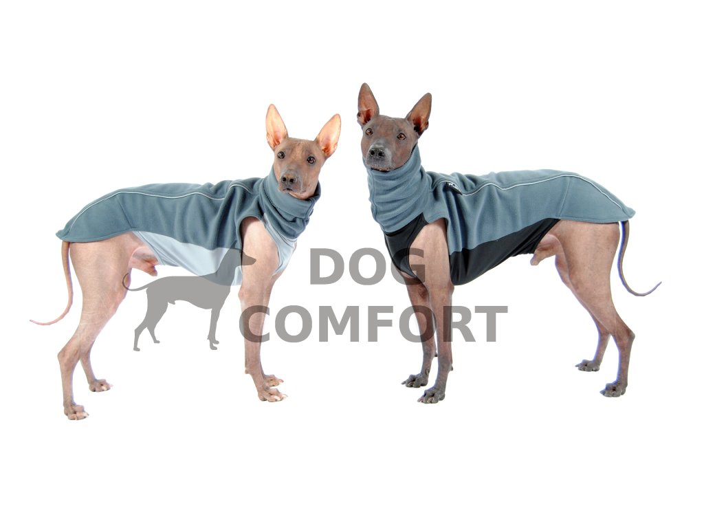 Upper layer of waistcoat is made of Micromoss antipilling fleece, down layer in made from Lacomfort. Upper layer is double (layer of fleece) around back it ensures warming up of dogs back. Fleece collar is long enough to protect all dogs neck.