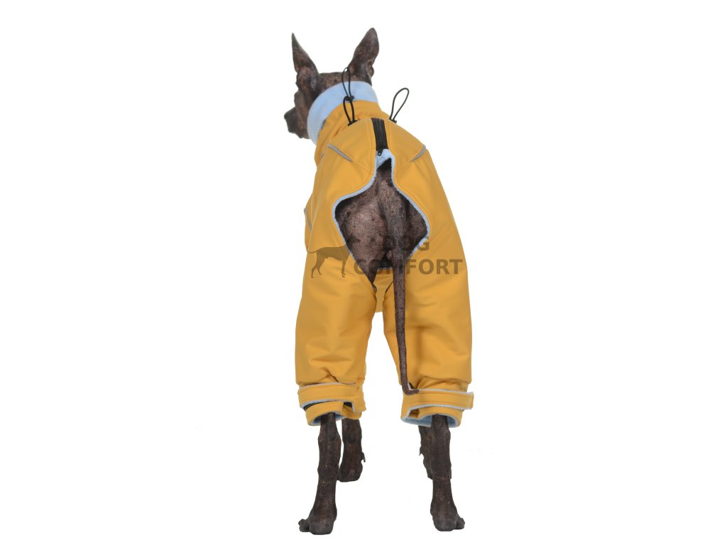 Jumpsuit is made of one layer of light stretch softshell and it is lined with layer of Thermaltec. Long Thermaltec collar fits tightly to neck and prevents the lost of heat. Thermaltec collar can be pulled over the head. Short softshell collar can be tighten up and it has cut which anables attach of the leash. Zip on back is underlaid, it protects dogs body from scratch. Long legs are provided by cuffs with velcro fastening and can be thigthen up by velcro fastening easily and fast. Jumpsuit protects all dog´s body and it is very easy to put on.