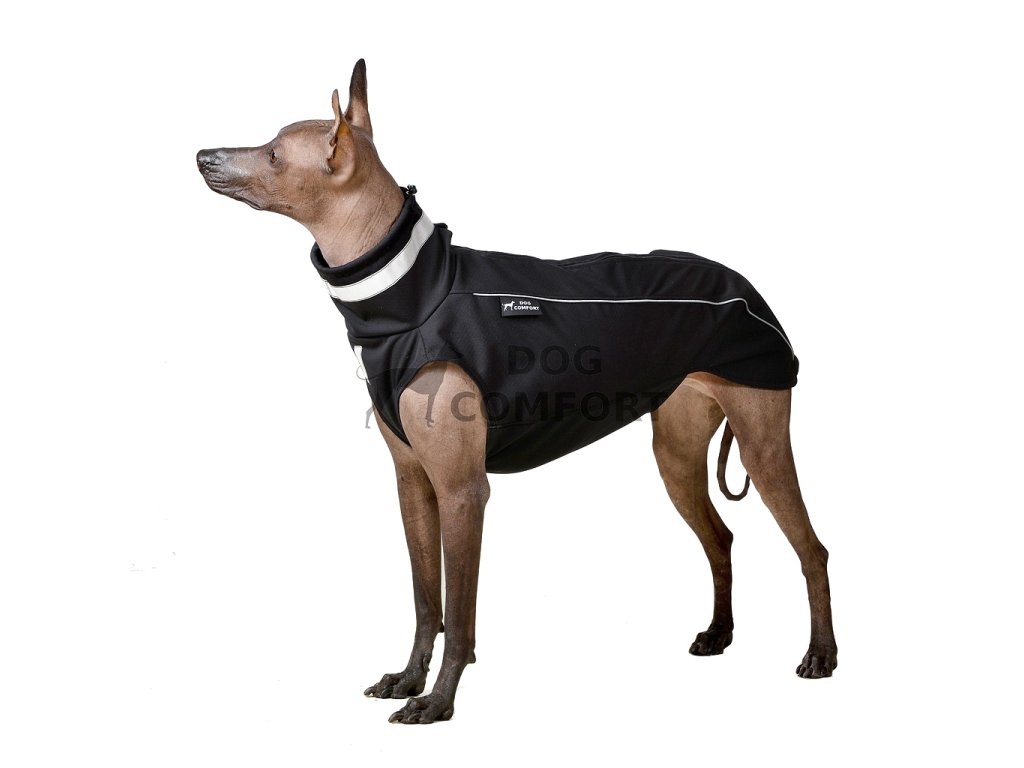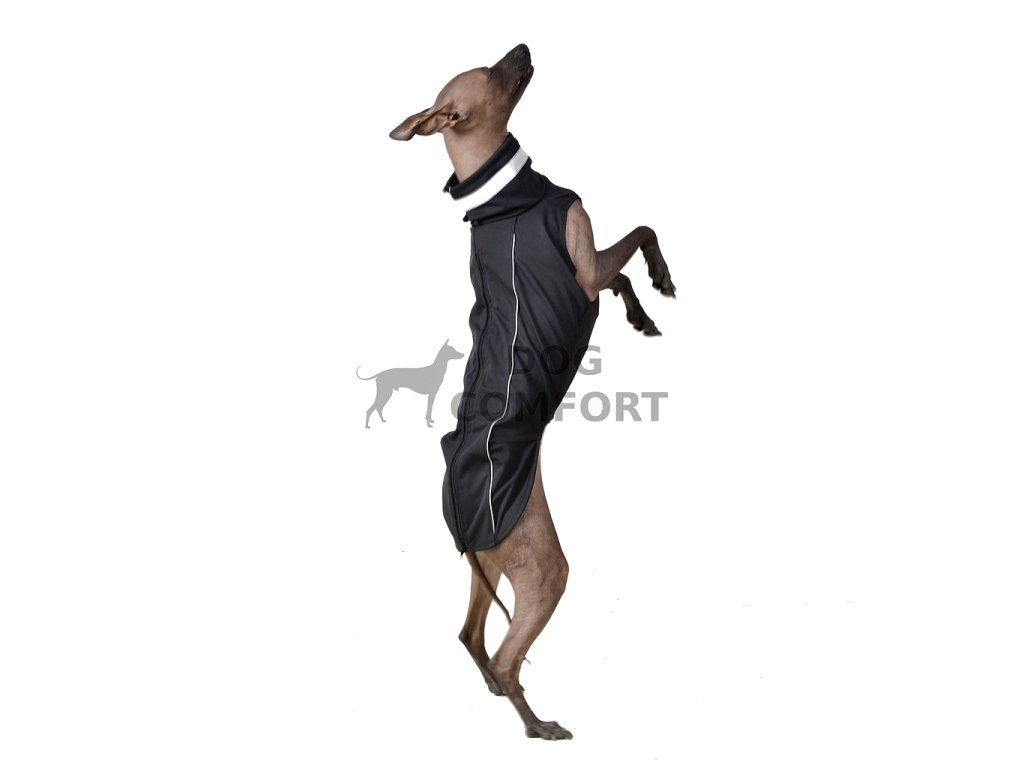 Waistcoat is made from winter softshell which has in reverse side wonen in fleece. Waistcoat´s design fits well on dog´s body and enables free movement however doesn´t stick out while moving and is very easy to put on and take off. Waitcoat is provided by fastener, fastener is lined to avoid scratch of dog´s back. Collar is provided by hole for a leash attach.