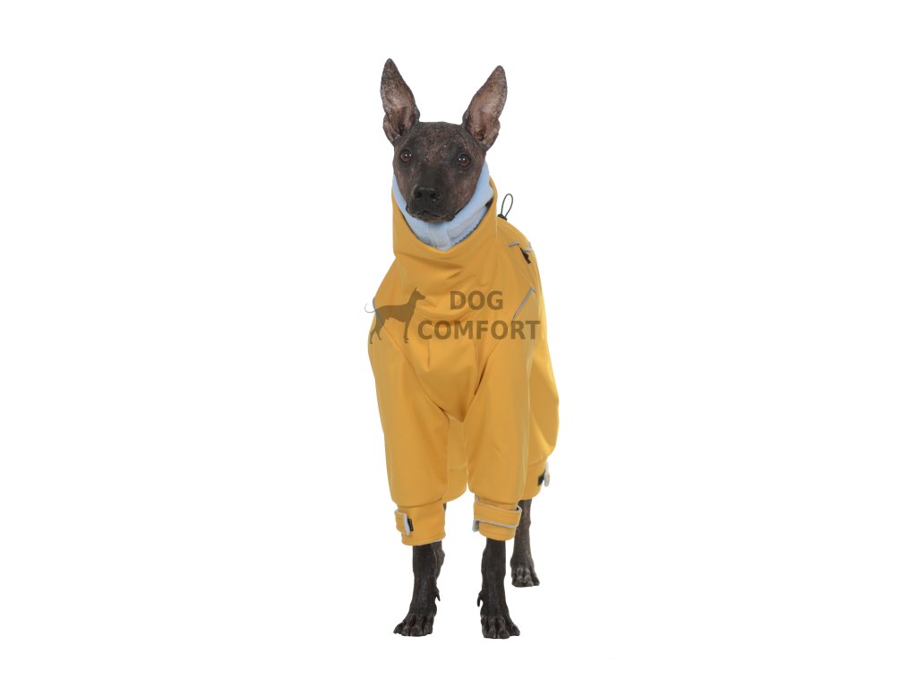 Kombinéza je tvarována tak, aby chránila celé tělo, přední i zadní nohy velmi snadno se obléká. Krátký softshellový límec je opatřen stahováním a přůstřihem pro snadné uchycení vodítka. Dlouhý Thermaltecový límec přiléhá ke krku a tím zabraňuje úniku tepla, je možné ho přetáhnout přes hlavu. Zip je na zádech podložený, aby nedocházelo k oděru zad psa. Nohavice jsou opatřeny manžetami se suchými zipy, které lze pohodlně a rychle utáhnout.